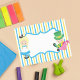 Adesivos fofos da Alice no País das Maravilhas com um tema divertido de livro infantil. Menina Alice em seu vestido azul e o Chapeleiro Louco sentam-se em um bonito papel de jardim listrado de azul e amarelo.