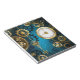 Turquesa, texturizada, fundo steampunk com latão e engrenagens douradas, chave prateada e relógio. Estilo Steampunk.