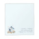 Bloco de notas de quarenta folhas com desenho de galinheiro azul. Adicione texto na parte inferior. A amostra é o nome e endereço em um estilo de fonte impressa divertido. O design está no canto inferior esquerdo, com galinhas, galo, pássaros e flores silvestres por um galinheiro azul claro.