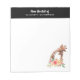 Um bloco de notas com um desenho fofo em aquarelas de uma girafa-mãe e bebê. A girafa-mãe está descansando a cabeça sobre a girafa do bebê, amorosa e adorável. Bonito buquê rosa, amarelo, verde, de flor de aquarela colocado debaixo deste par de queridos. Uma borda preta ao longo do topo com seu nome personalizado e texto que diz" da mesa de".