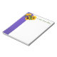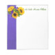 Bloco de notas branco de 5,5" x 6" com uma imagem de três girassóis amarelos brilhantes e de mar azul e uma grande borda roxa. Texto opcional. Essa variedade de estática produz grandes aglomerados de flores azuis profundas durante uma longa estação, perfeitas para uso tanto em arranjos de flores secas como frescas. O girassol (Helianthus annuus) é uma planta nativa anual das Américas. Possui uma grande inflorescência (cabeça florida) e seu nome deriva da forma e da imagem da flor, muitas vezes usada para representar o sol. Consulte notebook correspondente. Consulte a coleção inteira de Bloco de Notas Flores e Plantas na seção OFFICE.