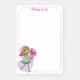 Cute mini art of a whimsical girl with long flowing yellow hair and wearing a green dress and striped stockings. She is holding a beautiful bunch of red roses in her outstretched hands. Originally made as digital art, An adorable way of keeping track of your things to do.