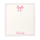 Make everyday notes a little more charming with this personalized notepad featuring a sweet watercolor pink bow in a soft coquette aesthetic. Feminine, flirty, and delightfully pretty, it's easily personalized with your name in an elegant script font, adding a graceful personal touch to each page.
