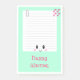 Brilhe seu dia com nossas Notas Felizes! Estas notas adesivas de 4" x 6" apresentam um fundo verde branco e claro, decorado com uma linda face feliz kawaii e pequenos corações, trazendo um toque alegre e divertido às suas notas, lembretes e mensagens. Personalizado apenas para você! Personalize com seu próprio texto - Adicione nomes, aspas ou mensagens especiais Perfeito para presentes - Um item de papelaria atencioso e exclusivo para amigos, familiares ou colegas de trabalho Excelente para marcas - Personalize para notas de negócios, ofertas de escritório ou eventos. Perfeito para: Listas de Ações a Fazer - Acompanhe as tarefas diárias de forma divertida Afirmações Positivas - Escreva mensagens elevatórias para aumentar o seu humor Notas do Trabalho e do Escritório - Adicione um toque lúdico ao seu espaço de trabalho Lembretes da Escola e do Estudo - Faça anotações mais agradáveis, Oferecendo & Scrapbooking - Cute e criativo para projetos pessoais Mantenha-as na sua mesa, planejador, geladeira ou em qualquer lugar um pouco de felicidade extra!
