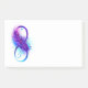 Símbolo infinito com uma bela pena pintada em cores roxas e azuis brilhantes sobre fundo branco.