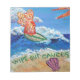 A pintura mostra um anjo surfando laranja brilhante em um oceano azul com um sol brilhante. A espuma do mar lava-se na areia que rodeia as palavras "Limpar o Cancer". Há uma casca de mar rosa na praia. A pintura foi feita em acrílico e aspergida com brilho para textura e brilho. Personalize este bloco de anjo de canceres com o seu próprio texto e imagens usando a opção personalizar.