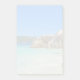 Notas pegajosas com uma fotografia de uma praia azul-oceânica turquesa com grandes rochas espalhadas ao longo da costa. Local tropical brilhante e ensolarado.