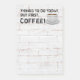 Esta é uma das minhas citações de café favoritas e eu coloquei-a nestes blocos de notas de 4"x6". COISAS A FAZER HOJE. MAS PRIMEIRO, CAFÉ! está contra uma parede branca de tijolos. No canto superior direito está uma xícara de café a vapor.
