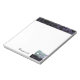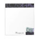 Bloco de notas branco de 5,5" x 6" com uma imagem, no topo, de um local roxo sobre preto. Na parte inferior direita está uma imagem de uma rendas roxas sobre preto, uma bela fenda de máscara com fitas de azul, ouro, verde, roxo e fúcsia com cintilação prateada. Texto opcional. Veja toda a coleção de Notepad do Mardi Gras nos TOUCHES ESPECIAIS | Seção Favoritos para festas.