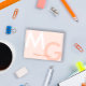 Pêssego e anotações corais com suas iniciais em dois tons correspondentes, e seu nome em um roteiro moderno.