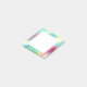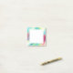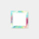 Notas pegajosas com um design abstrato legal e na moda. As aquarelas se misturam e se misturam para criar a ilusão de uma imagem espacial. Verde com espirais de púrpura, amarela e vermelho-claro misturados com uma mistura de pontos brancos e estrelas. Uma criação artística elegante. Um quadrado branco em camadas acima para escrever dentro.