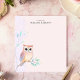 Adicione um toque de capricho às suas notas com este bloco de notas personalizado e charmoso. Uma delicada ilustração aquosa de uma coruja doce empoleirada em um galho folheado decora o canto inferior esquerdo. O fundo macio e pastel fornece um adorável pano de fundo para o seu texto personalizado. Este bloco de notas é perfeito para listas de tarefas, lembretes ou mensagens curtas. Uma adição deliciosa a qualquer mesa ou um presente pensativo.