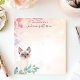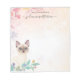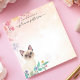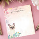 Mostre seu amor por gatos siameses com este lindo e personalizado bloco de anotações! Uma ilustração encantadora de um gato siamês, com olhos azuis gritantes, espreita para fora do canto inferior esquerdo, cercado por flores e folhagem delicadas. O fundo macio e pastel adiciona ao apelo suave do design. Personalize este bloco de notas com o seu próprio texto. Perfeito para amantes de gatos, listas de tarefas ou notas rápidas.