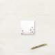 Quis que o design deste bloco de notas adesivas tivesse uma sensação leve e arejada, com flores silvestres cor-de-rosa e azuis suaves florescendo ao longo da borda inferior. É perfeito para quem quer um pouco da sensação de um jardim sem sobrecarregar a página. Deixei muito espaço aberto no topo para que a sua mensagem — ou o seu nome — seja o foco principal.