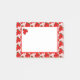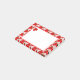 Adesivos com um padrão de fundo de morangos vermelhos, uma moldura vermelha e um trio de morangos no canto.