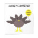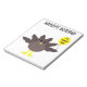 Este incrível bloco de anotações apresenta um desenho engraçado de um peru com grandes olhos pretos, um pequeno bico amarelo e penas de cauda grudadas. Os pés estão voltados em direções opostas, fazer o peru parece desajeitado. O peru está segurando um balão amarelo com um dentro de mensagem que diz "é hora do peru". Esta é uma design de festa de ação de graças divertida. Há texto personalizável no topo do bloco de notas, permitindo que você o personalize para si mesmo ou o transforme em um presente adorável para outra pessoa.