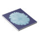 Este incrível bloco de anotações apresenta uma fotografia de uma flor de marigold que foi manipulada para torná-la uma cor azul clara e gelada. A flor se senta sobre um fundo azul escuro.