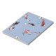 Apresenta um design gráfico de carpa koi contra fundo azul, baseado na arte tradicional japonesa. Os peixes são animais ornamentais frequentemente mantidos em lagoas em jardins orientais, e eles podem simbolizar amor romântico, afeto e amizade, porque a palavra "koi" em japonês é pronunciada da mesma forma que outra palavra que significa "amor".