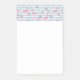 Notas pegajosas com um padrão com uma vibração de verão divertida. flamingos e abacaxis cor-de-rosa, colocados sobre um padrão listrado azul claro com folhas e corações ao redor.