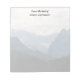 Um bloco de notas com uma fotografia de belas montanhas, céu nublado e colinas rolantes cheias de árvores em primeiro plano. esquema de cor azul da cinza.
