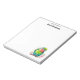 Bloco de notas com uma ilustração fofa de papagaio. Um pequeno papagaio verde com cores azuis e amarelas se misturando. O pescoço tem um tom vibrante de rosa avermelhado.
