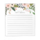 O bloco de notas floral chico apresenta uma borda superior de pêssego e flores, botões e botânicos verdes cor-de-rosa esbranquiçados. Personalize com duas linhas de texto personalizado em letras modernas; mostradas com a saudação francesa "bonjour" e o seu nome. Pautado.