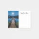 Notas pegajosas com uma bela fotografia de um píer de madeira esticado sobre um lago calmo. O céu noturno coberto de estrelas e uma bela lua de cheio.