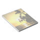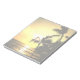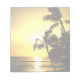 Um belo pôr do sol da praia tropical decora um lado de cada pedaço de papel neste tablet. Você pode escrever no lado "virado para baixo" mas sempre terá uma fotografia especial mostrada como um toque decorativo.