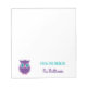 Professores Personalizados de Coruja Púrpura e Cuta Notepad. Da mesa de anotações para seu professor favorito. Personalize estas notas bonitas em roxo escuro e cursivo. Font lê "FROM THE DESK OF" no bloco impressão. Coruja branca, roxa, rosa e colorida, no canto inferior destas notas personalizadas.