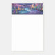 Notas pegajosas com uma bela ilustração. Vírus caprichoso e fantasioso. Uma bela paisagem de árvores, montanhas e um rio sinuoso. Mística.