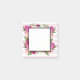 Pequenas notas adesivas quadradas com um buquê floral composto por rosas de rosa claro e papoilas cor-de-rosa-escuro com muitas folhas verdes e peludas. Um quadro em camadas acima para gravar dentro. O fundo é um padrão de listras rosa-macio.