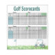 Pasta de anotações do templo Golf, com três scorecards em cada página. Placas gráficas coloridas, na parte inferior de cada página, tem um cartão de golfe, verde-pastoso e uma bandeira de buraco, com bola.