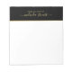 Bloco de notas profissional moderno com nome no estilo de letra dourado do script moderno com texto personalizado no estilo de letra dourado sans serif, a preto com faixa dourada superior, em fundo branco. Note que os detalhes da folha são simulados no trabalho de arte. Não será utilizada nenhuma folha de alumínio real no fazer deste produto.