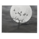 Um bando de corvos negros na silhueta voa sobre uma paisagem desolada assustadora em frente a uma lua de cheio.