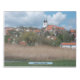 Num campo no campo húngaro, olhando para os montes e edifícios de uma cidade. As nuvens estão no céu azul, mas o tempo permanece ensolarado e quente.