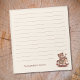 Um bloco de notas com uma ilustração de um brinquedo de madeira: um ursinho de pelúcia sorridente cavalgando um cavalo balançando em tons quentes, e um texto personalizável. Se você preferir espaço no vazio, poderá excluir as linhas.