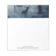 Notepad com uma foto de um veado real com galhadas em uma floresta sombria entre árvores iluminadas pelo sol. Neve caindo por toda parte.