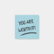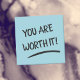Vale a pena postar positivamente, como nota. Nota azul com negrito "você vale a pena" dizendo e uma linha sublinhando o texto. Notas positivas excelentes a serem usadas como lembrança do seu próprio valor. Use-os como uma ferramenta para motivá-lo a ajudá-lo a lembrar-se de que você vale todo o trabalho e esforço duro que está fazendo em suas atividades. Outra utilidade para estas notas de posto positivas incríveis é transformá-las em notas de rodapé. Poste-os em vários lugares e deixe que seja seu ato aleatório de gentileza dar uma chance de positividade a qualquer pessoa que os veja e leia. Sua pequena mensagem pode ajudar a mudar a vida de alguém de uma maneira boa.