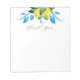 Este bloco de notas botânico apresenta limões de aquarela em tons de amarelo com botânicos azuis e verdes. As palavras "Obrigado" são definidas na tenda tipografia escrita escrita à mão. Use para as notas de agradecimento. Para ver a suíte de casamento azul e amarelo do Mediterrâneo visite www.zazzle.com/dotellabelle Arte e design de Victoria Grigaliunas