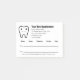 This notepad says "Your Next Appointment" at the top. Lines of black display text are available for the name of the medical practice, street address, phone number, and website. There are also lines for the date and time of the appointment. The bottom has display text you can edit to show a custom message. A smiling tooth is near the top. All text can be edited or deleted.