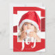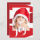 Um design contemporâneo de blocos coloridos em vermelho festivo e branco inclui uma mensagem manuscrita para alegria neste moderno cartão com fotos de férias estilizado.