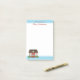 Um desenho animado e fofo de um prédio vermelho e branco com telhado marrom. Há uma área de texto na parte superior que agora lê "Da escrivaninha de" junto com uma área de texto personalizável para um nome. No topo e no fundo há bordas azuis suaves.
