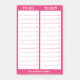 Almofada de nota pegajosa personalizada da lista que caracteriza uma cor do rosa quente, "para fazer" a lista e "para comprar" a lista e uma família, um negócio ou um nome do indivíduo na parte inferior.
