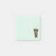 Blocos de notas adesivas com uma ilustração simples de um urso marrom de desenho animado segurando uma margarida amarela. Olá escrito acima de sua cabeça. Fundo verde pálido.