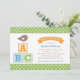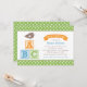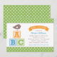 Este convite de chá de bebê temático de alfabeto adorável apresenta um passarinho fofo empoleirado em blocos de letras ABC coloridos com um título de banner e borda de bolinhas verdes brilhantes. O design alegre e neutro em relação ao sexo é perfeito para dar as boas-vindas a um bebê menino ou menina. Toda a redação é totalmente personalizável para o seu evento.
