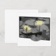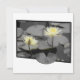 Esta imagem fora do quadro apresenta dois lírios de água delicados em matizes macios, amarelo-pálidos, destacando-se claramente contra um pano de fundo de almofadas, lírios cinza e água. As flores estendem-se para além do quadro delimitado por preto, criando um efeito dinâmico, quase tridimensional. O contraste entre os florescentes vibrantes e os subjugados arredores destaca a delicada beleza e tranquilidade da cena, evocando um senso de calma e elegância silenciosa.