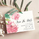 Os cartões salve a data florais elegantes apresentam peônias de aquarela em cor rosa-de-verão rica, acentuadas com folhas verdes e peludas. Personalize com seus nomes, data de casamento, local e site de casamento ou informações de convite, abaixo de "salvar a data" em script de caligrafia. Cartões inversos a rosas sólidas.
