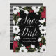 Guardar personalizável o anúncio de data com flores brancas e vermelhas e um roteiro de caligrafia moderno. Esta é uma parte de uma suíte de casamento "ANEMONE BLOOMS" - itens correspondentes estão disponíveis.