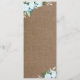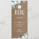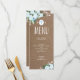 Menu personalizável com flores azuis de cor d'água em um fundo de burlap, perfeito para qualquer celebração religiosa.