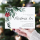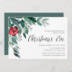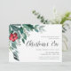 Os convites para o janto Elegante e festivo da véspera de Natal apresentam folhas de cor aquosa de eucalipto e folhagem verde em cascata do canto superior esquerdo, realçada com uma flor de solteiro em vermelho de festas vibrantes. Personalize com seus detalhes de janto alinhados à direita, embelezados com "Véspera de Natal" em roteiro de caligrafia. Convites invertendo ao verde florestal sólido.